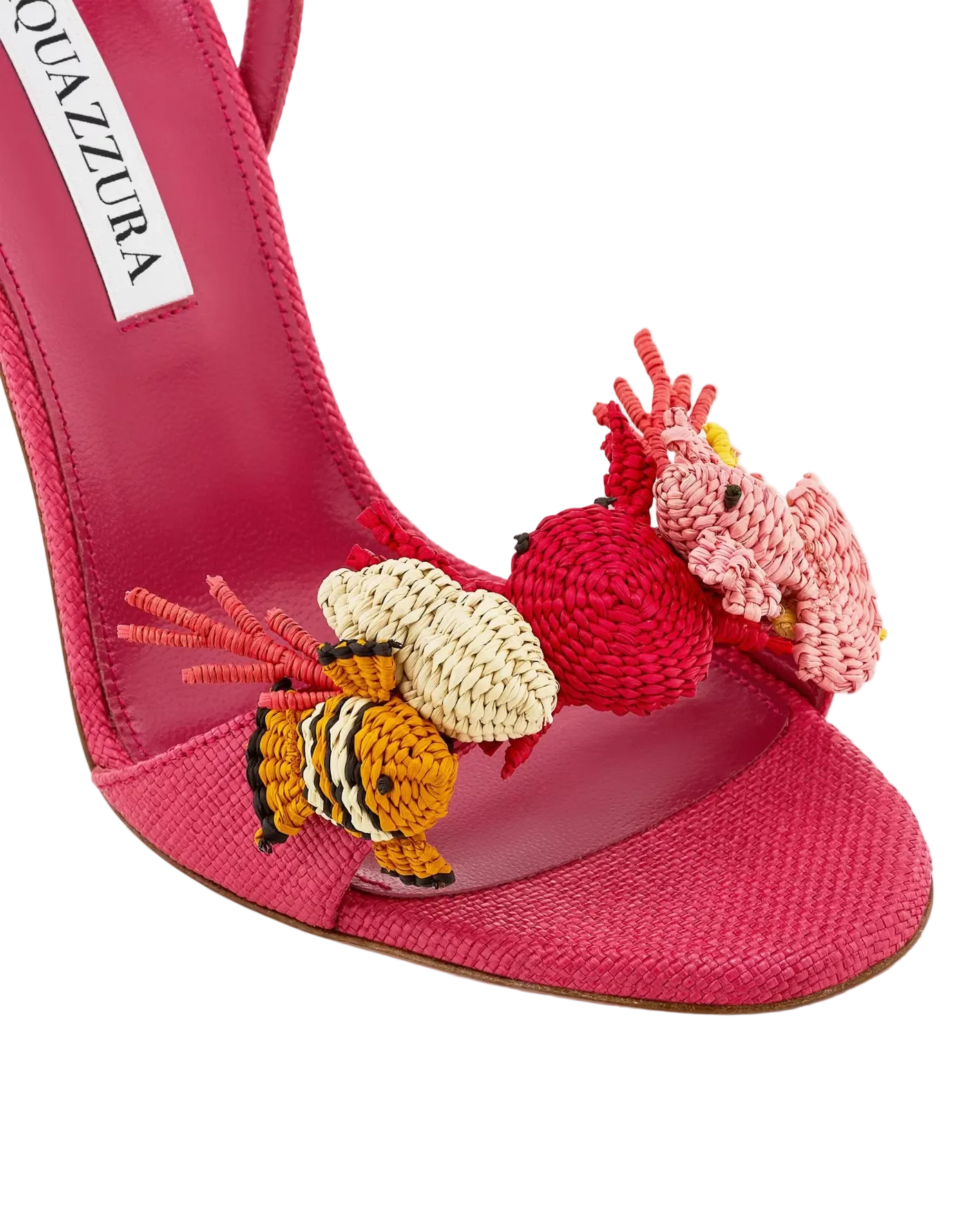 Pink high-heeled sandal with tassel and embellishments on a white background